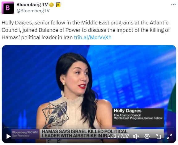 今天在彭博电视台的权力平衡早间节目中,主持人乔·马修和凯莉·莱因兹采访了大西洋理事会中东项目的高级研究员霍利·达格雷斯,谈论了哈马斯在伊朗政治领袖遇刺事件的影响。