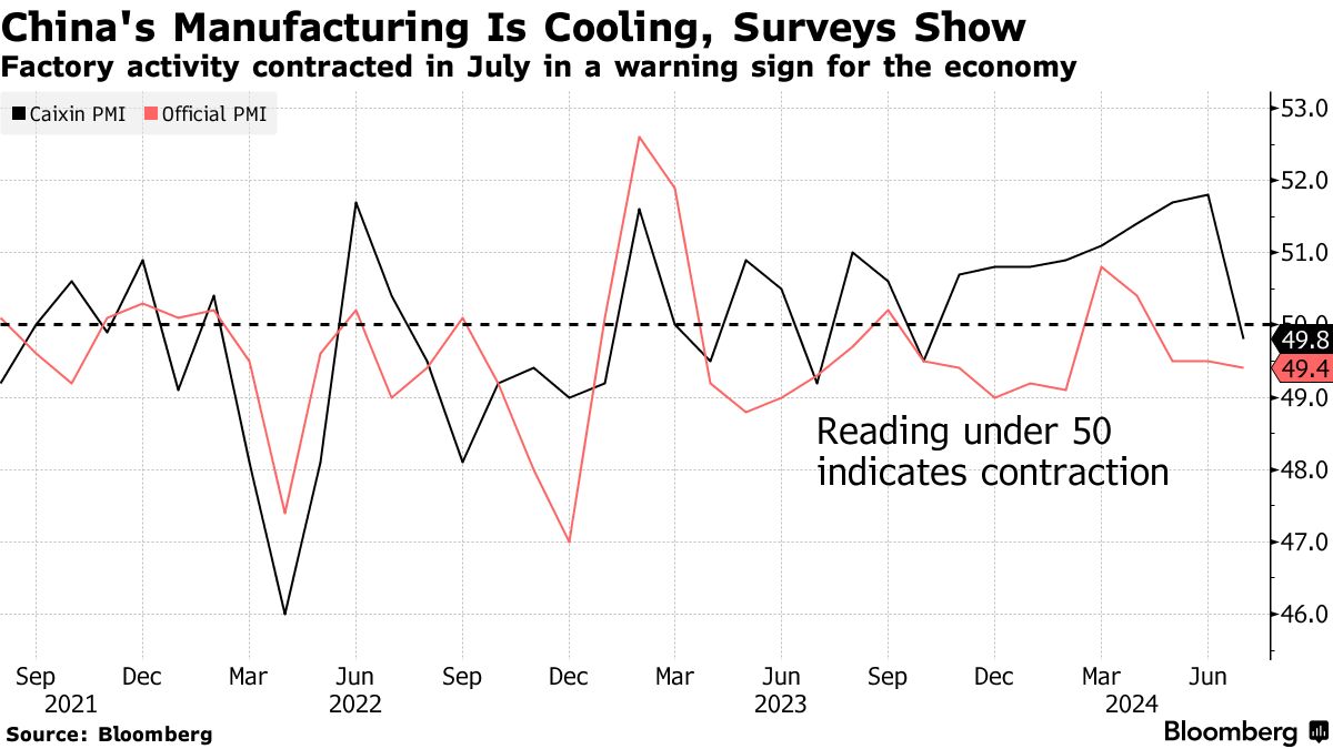 这一私人指标可能反映了海外出货动能的减弱,因为它关注小型和出口导向型企业。这一悲观数据是中国第二大经济体中一个罕见亮点的又一个警告信号,此前一项官方数据显示,7月份工厂活动连续第三个月 收缩。