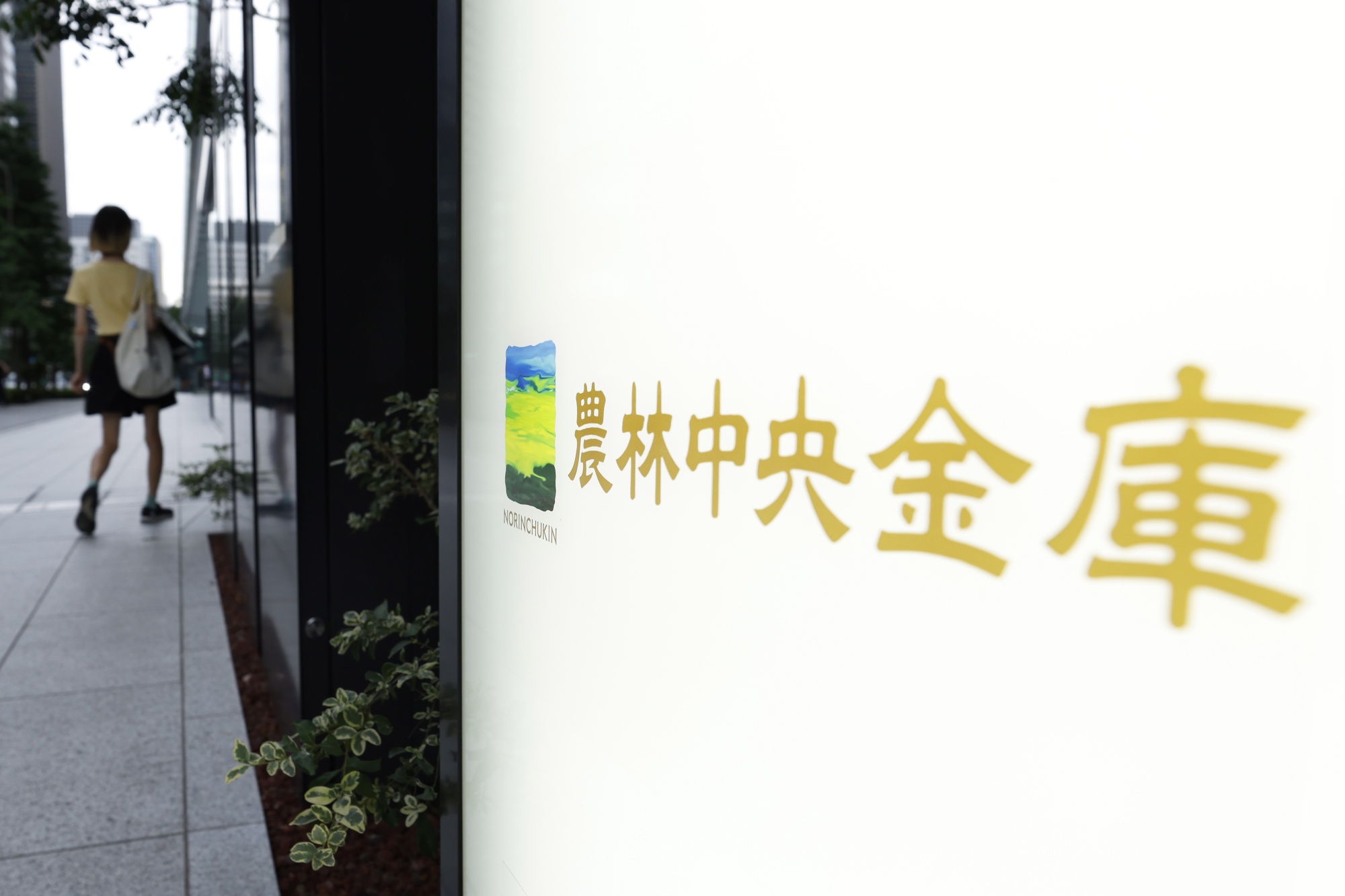 东京大厦外的Norinchukin银行标识,该建筑是该公司总部所在地。