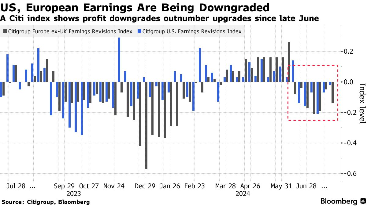 在盈利方面,花旗集团指数显示,随着季节的推移,分析师变得更加悲观,自6月底以来,美国和欧洲的利润下调超过了上调。
