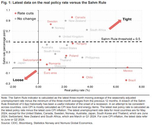 随着大多数发达经济体通胀受控,央行正在将焦点转向就业市场 — 如上所述。为此,野村经济学家罗布·苏巴拉曼已经研究了21个经济体的实际政策利率与Sahm规则之间的相互作用。