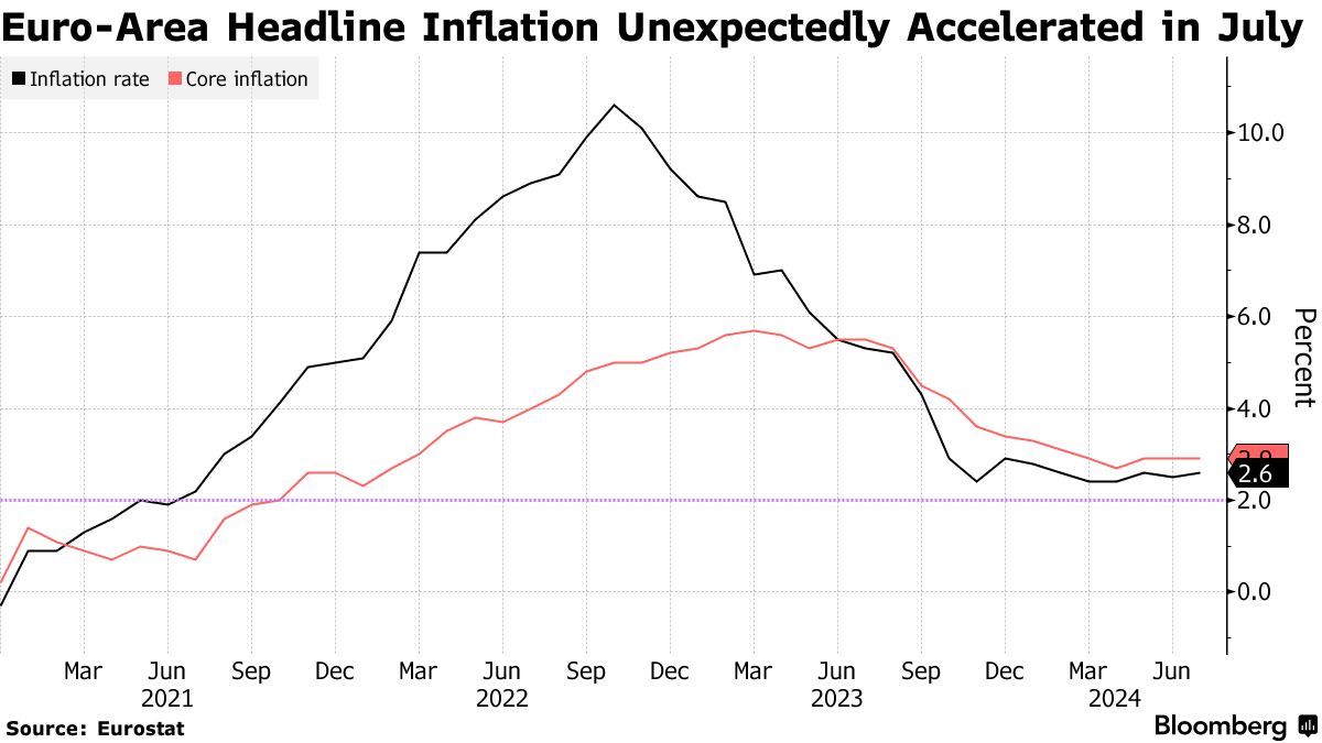本周一系列经济报告向决策者发出了矛盾的信号。德国意外陷入衰退,第二季度增长略低于欧洲央行在6月份的预测。与此同时,通胀上个月加速,剔除波动性组成部分的核心指标保持稳定。