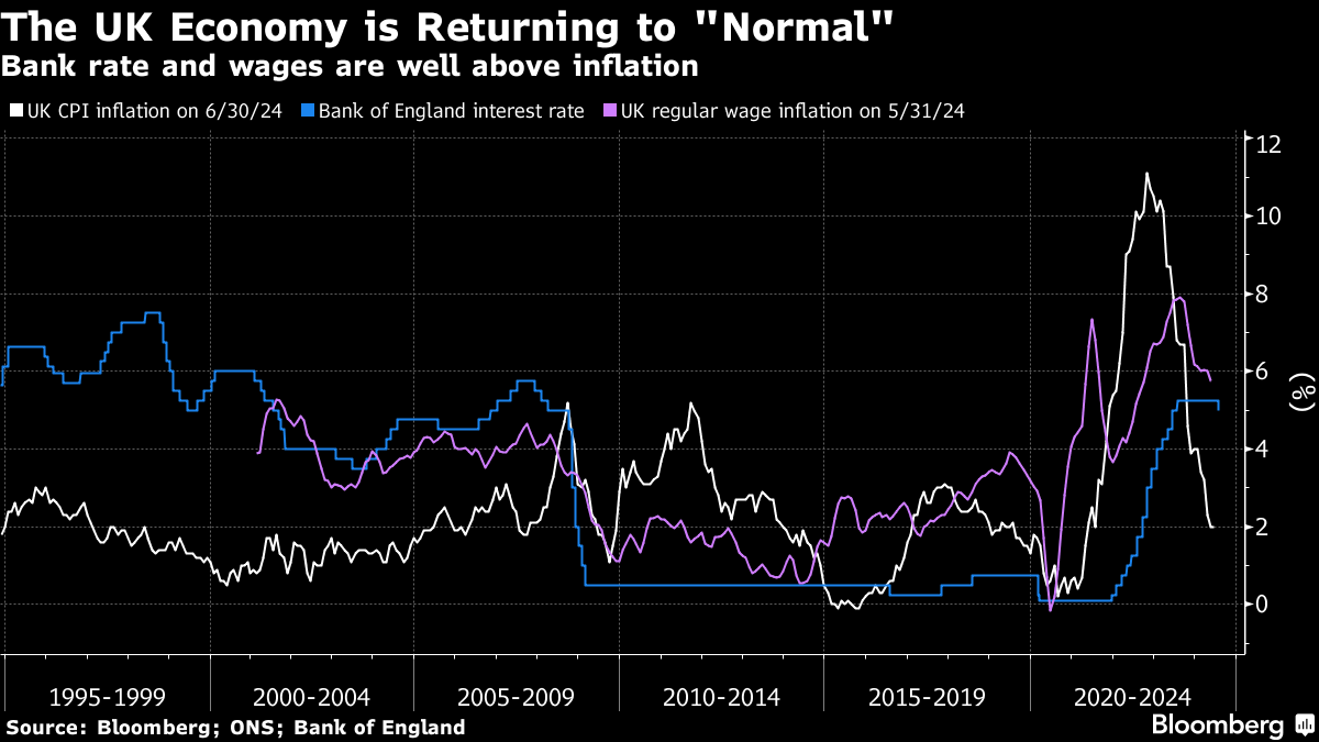 通货膨胀不会进一步下降太多,但也不太可能在短期内再次上升至3%以上(尽管永远不要说永远——英格兰银行预计今年年底将达到约2.7%)。而且,随着欧洲央行(ECB)已经降息,美联储被视为可能很快行动,现在将利率削减至5%并不是一个高风险的举动。