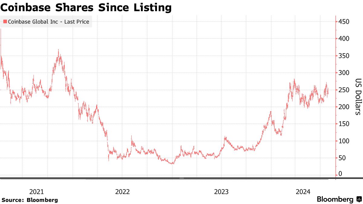 Coinbase的股价今年迄今上涨约30%,尽管这比市场风向标比特币在同一时期的涨幅约50%要低。去年股价几乎增长了五倍,而在2022年,随着加密世界遭遇丑闻和破产,股价暴跌了85%。