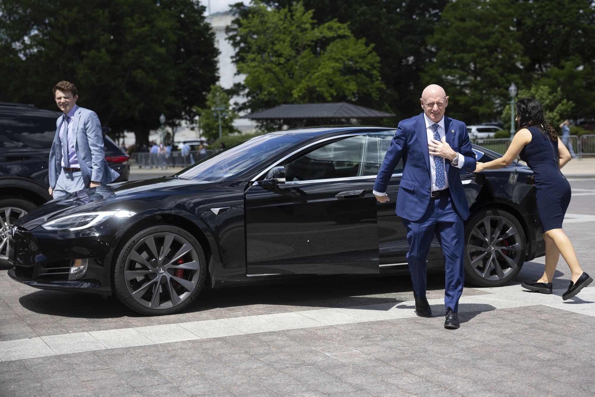 2024年,马克·凯利从特斯拉电动汽车中走出来。摄影师:弗朗西斯·钟/政治家通过美联社他还与共和党人约翰·麦凯恩的家族有着长期的关系,早在凯利赢得已故参议员的参议院席位之前,他就与他们有联系,并称他的海军飞行员同僚是他的个人英雄。