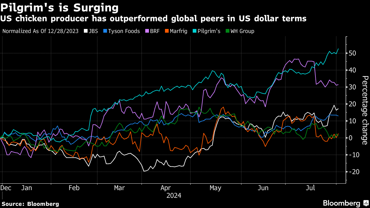 鸡肉生产商是受益最大的受益者之一,因为大豆和玉米价格下跌,这两种作物被用于动物饲料。他们还受益于消费者对寻找比牛肉更便宜的替代品的需求增加,因为美国的胸肉、大腿肉和翅膀等肉类库存下降。