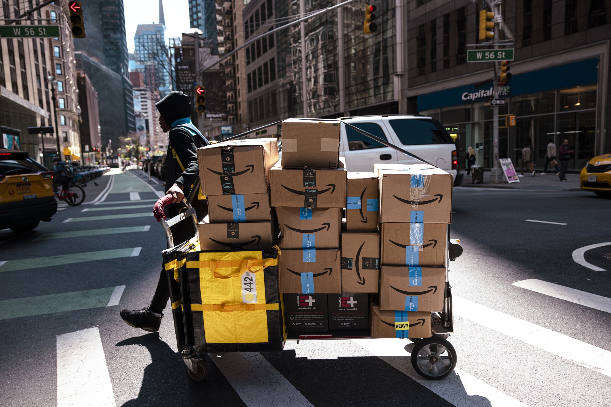 亚马逊的一名承包商在2024年4月22日星期一拉着一个包裹车在美国纽约进行投递。图片:Angus Mordant/Bloomberg