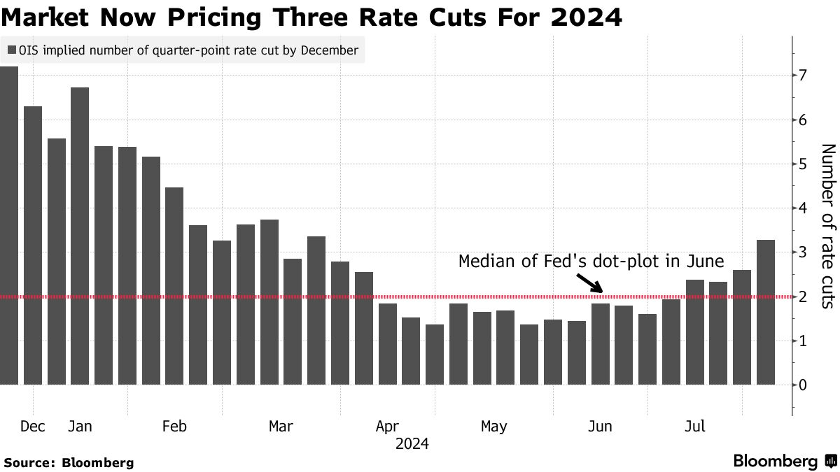 股市下跌部分反映了美国经济出现压力迹象以及美联储降息的可能时间。周四的数据显示,美国失业救济申请达到近一年来的最高水平,而制造业萎缩。这种担忧促使掉期交易商将今年预计的美联储降息次数从两次增加到三次。