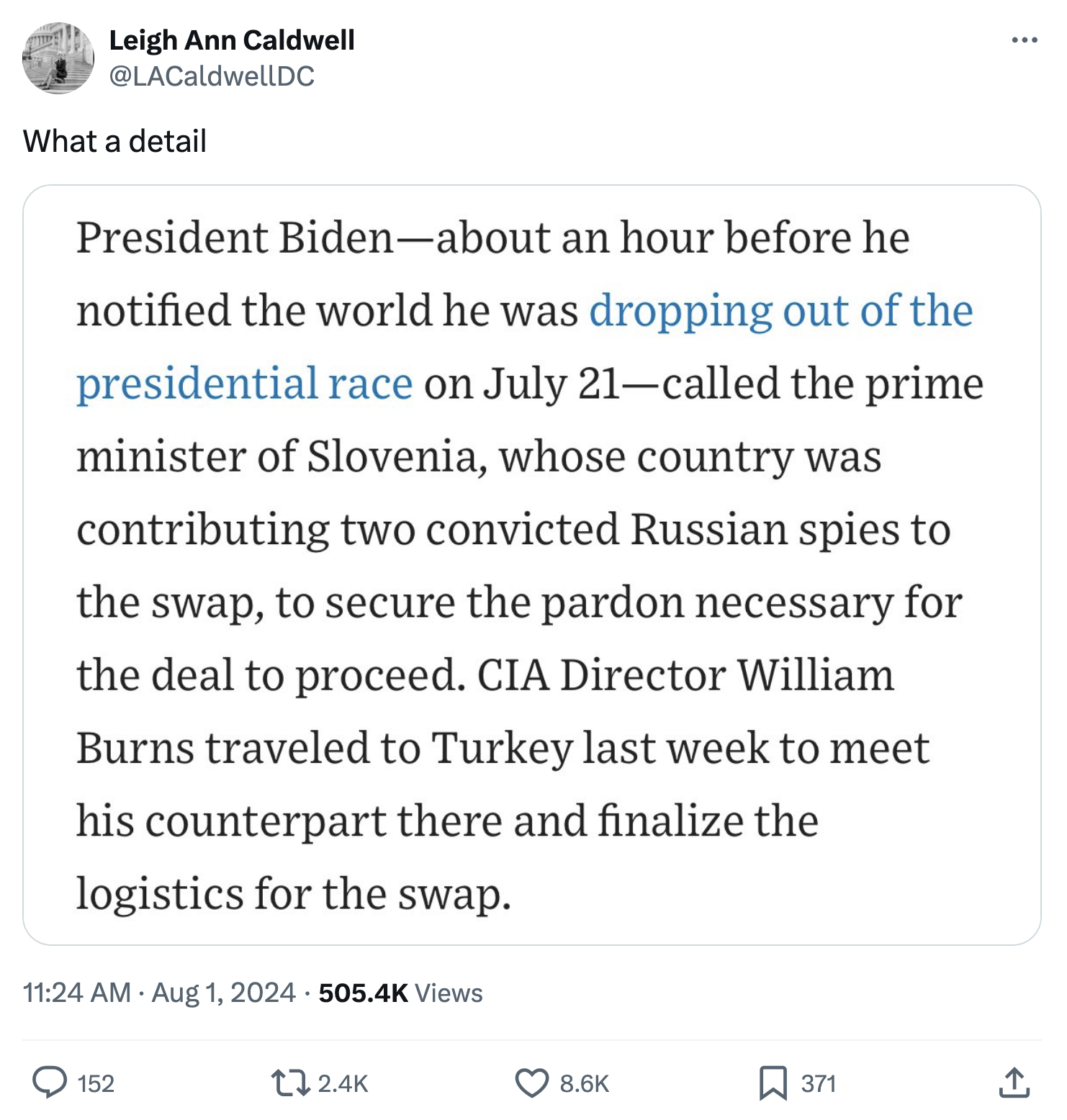 如果这不是优秀总统的教科书定义,那我不知道什么才是。这次交换让前总统唐纳德·特朗普处于尴尬的境地——他声称俄罗斯总统普京会为格什科维奇“为我而释放,但不会为其他人而释放”——结果,拜登也精通“交易的艺术”。全美国人都知道这一点。