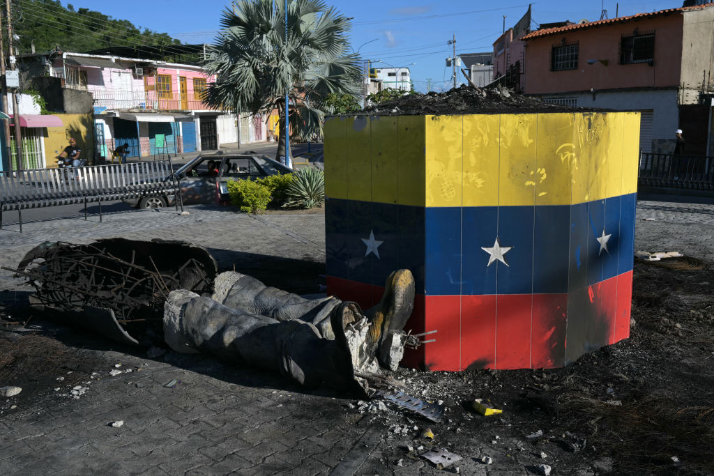 2024年7月31日在抗议活动中被摧毁和焚烧的已故委内瑞拉总统雨果·查韦斯雕像的残骸。摄影师:尤里·科尔特兹### 更多阅读