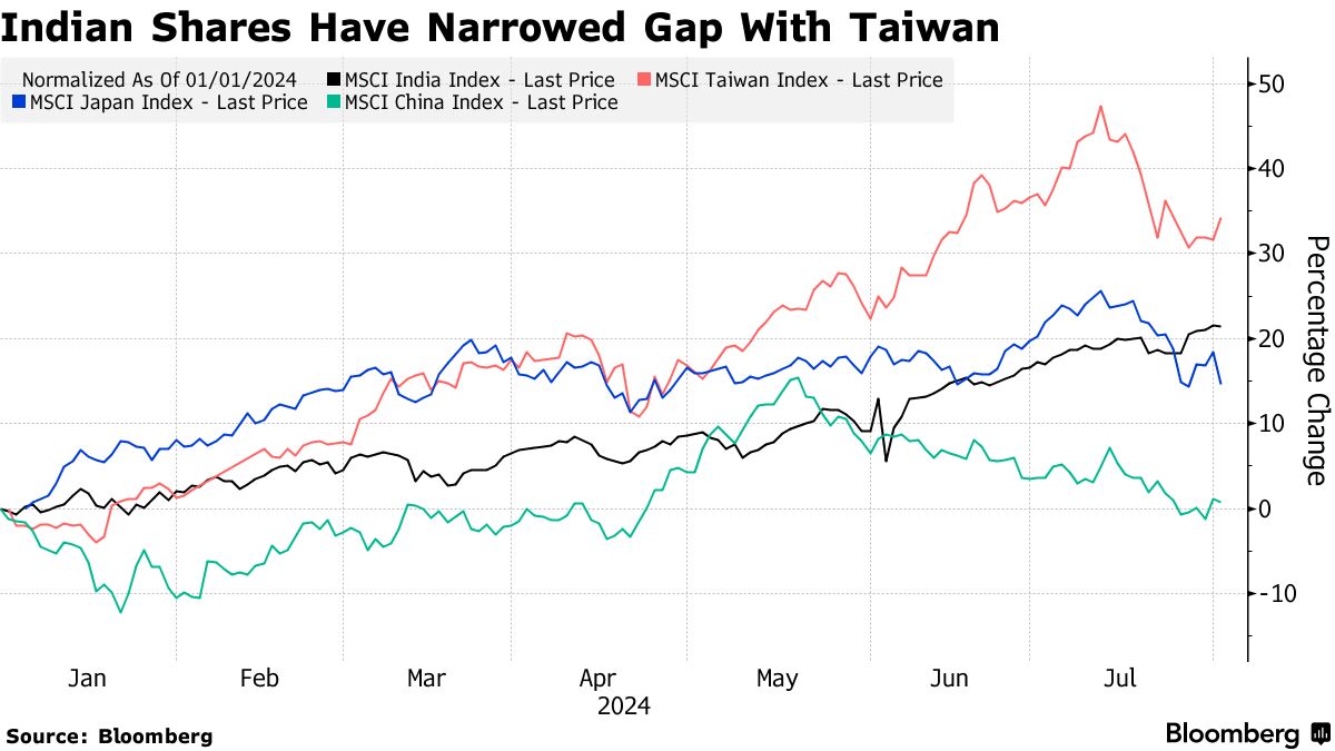 今年早些时候,印度股市落后于一些地区同行,但目前正在迅速迎头赶上。印度股票的MSCI指数今年已经上涨了超过20%,正在缩小与亚洲表现最佳的台湾之间的差距,从7月初的20个百分点缩小到仅13个百分点。尽管遇到了一些意外挫折,但大量的流动性推动了当地股市的上涨。六月季度的收益开始平淡,但投资者认为这只是国家经济增长前景强劲的暂时性挫折。