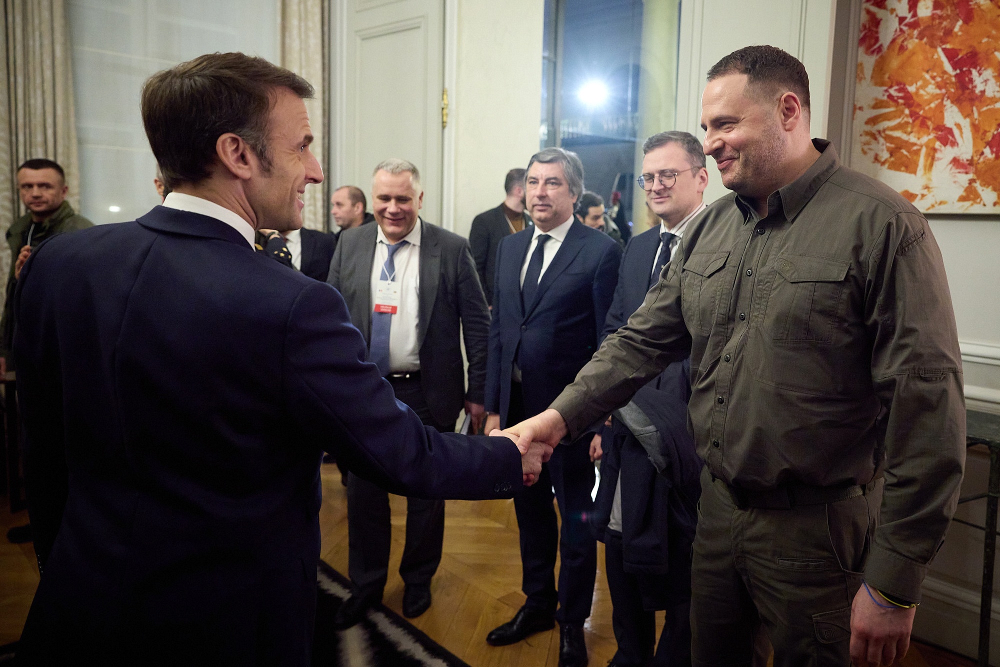 叶尔马克在巴黎爱丽舍宫与马克龙会面,时间是二月。摄影师:乌克兰总统府/手稿/安纳多卢/盖蒂图片社6月7日帖子在他的Telegram频道上展示了叶尔马克与美国总统乔·拜登握手的照片,而泽连斯基则在附近与国防部长劳埃德·奥斯汀打招呼 — — 这种协议上的颠倒引发了基辅的讽刺评论。