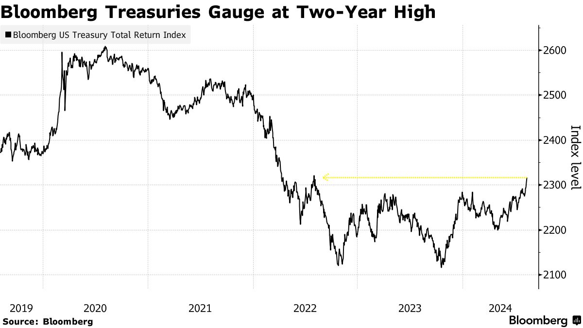 两年期国债正迎来第四个交易日的涨势,将收益率推低至2023年5月以来的最低水平。此前,彭博社的国债指数周四收于两年来的最高水平。黄金本周上涨了3.3%,接近7月中旬创下的历史最高水平。