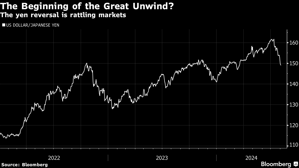 同时,日元“carry trade” — 即借入日元投资于高收益货币的行为 — 也是一个因素。与所有一边倾斜的交易一样,当它们明显逆转时,它们是自我强化的:摆脱这些亏损交易最终涉及购买日元和出售其他资产,导致日元更加强劲,迫使更多出售。