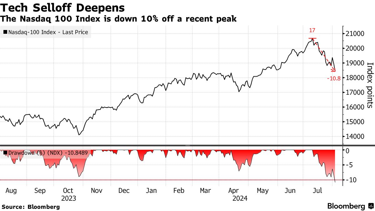 周五早盘,该指数下跌了1.7%,自7月10日创纪录以来的损失已超过10%,苹果公司领跌。如果这种情况持续到交易结束,它将符合修正的定义。该指数今年仍上涨了10%。