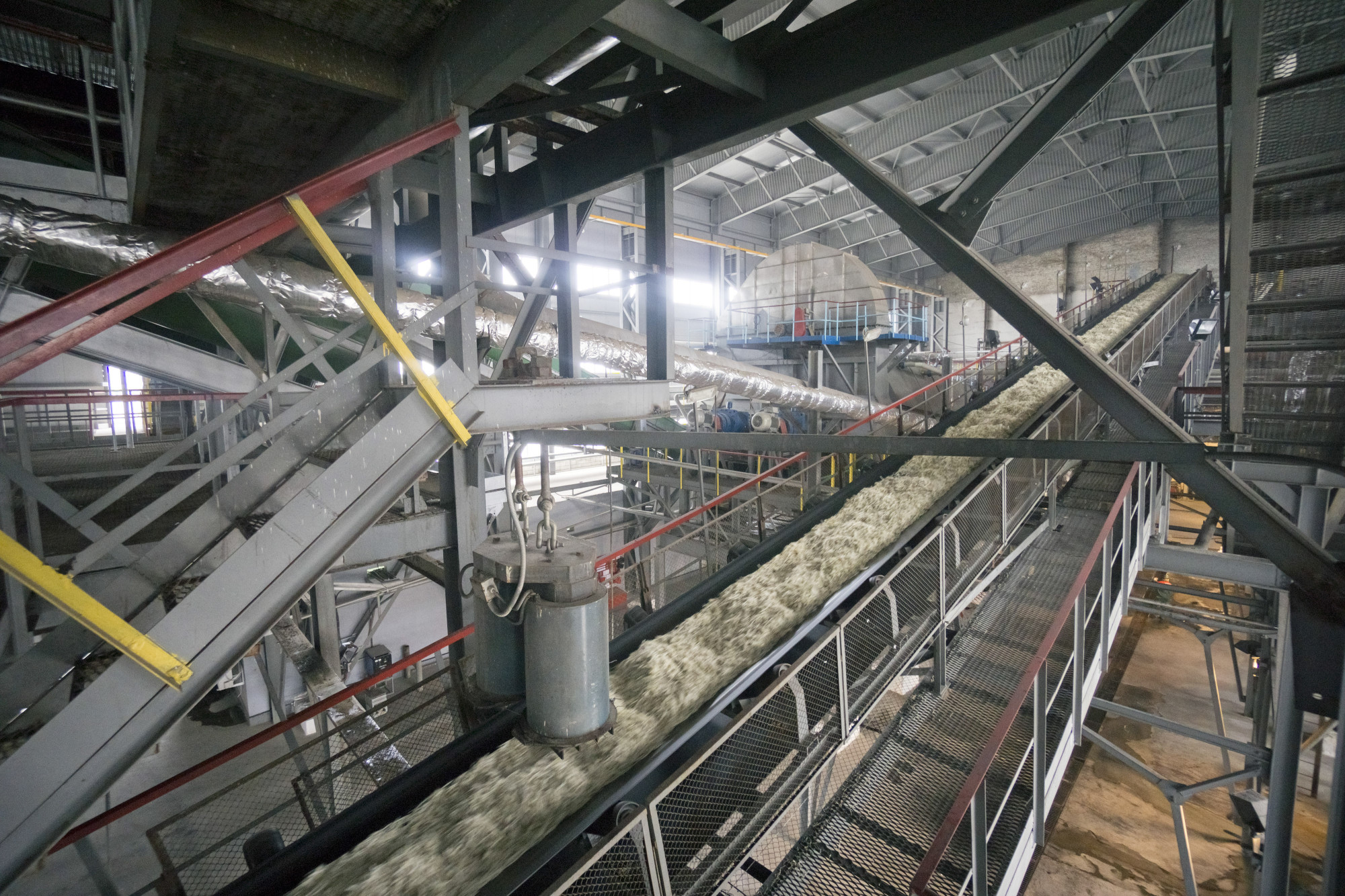 切碎的甜菜沿着2017年在乌克兰尼古拉耶夫的ED&F Man炼油厂的生产线移动。