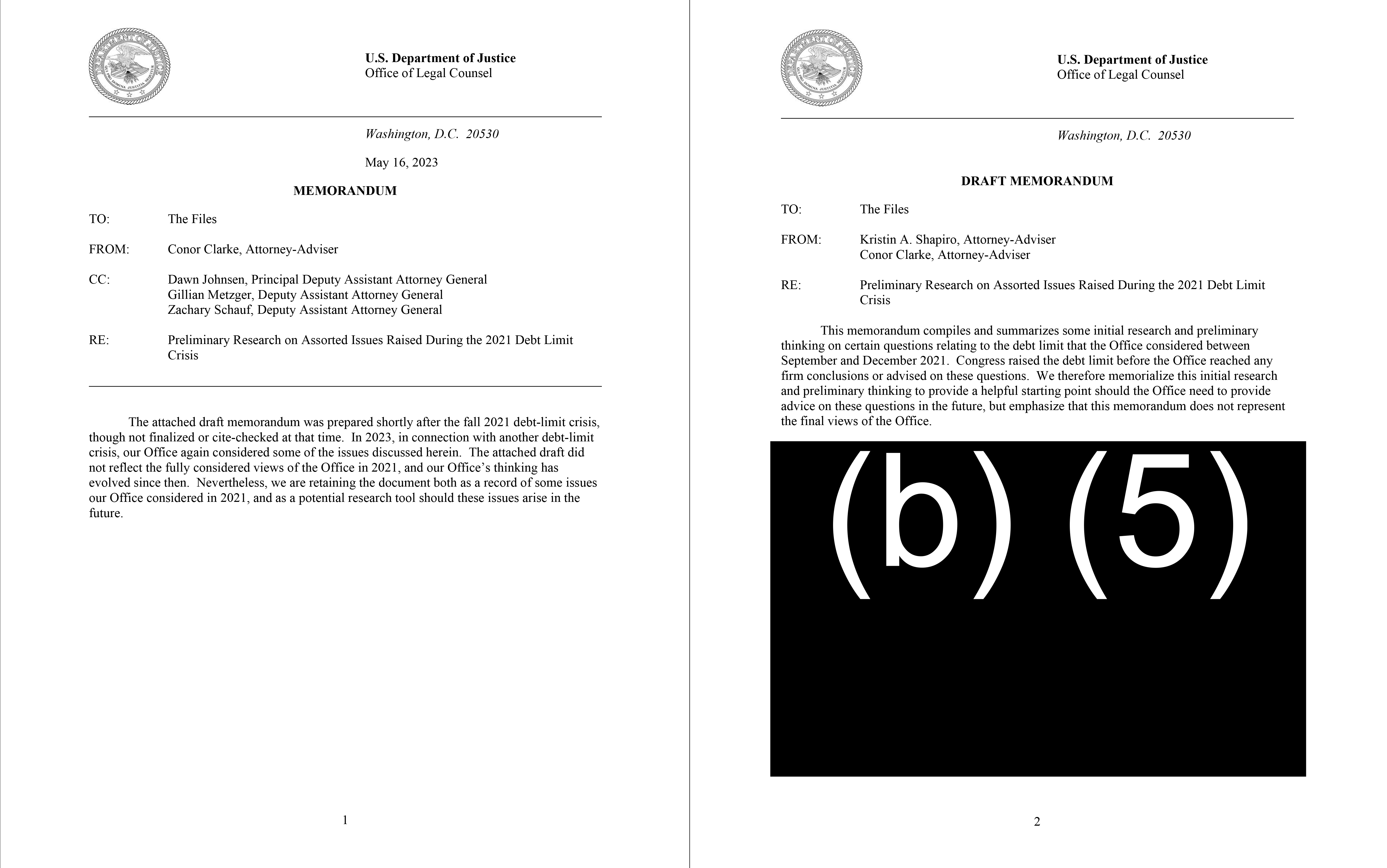 *点击此处查看文件(第10页,第12页)*下一份备忘录的日期是2023年5月16日,与去年的债务上限危机时间相吻合。有一小部分司法部律师被抄送了该备忘录。它基本上是一个附有2021年撰写的备忘录和26页研究报告“与办公室在2021年9月至12月期间考虑的债务上限有关”的封面。完全被涂黑了。