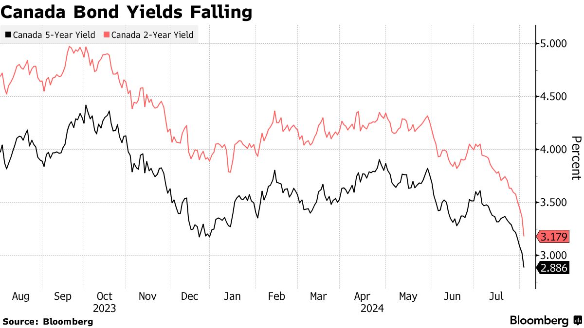 美国数据发布后,加拿大债券大幅上涨,加拿大政府五年期债券收益率在渥太华时间下午3点前下降了13个基点,至2.89%,为2023年5月以来的最低水平。隔夜掉期交易商完全定价今年还将再降息三次,增加了加拿大央行将在即将举行的每次会议上放松政策的押注。