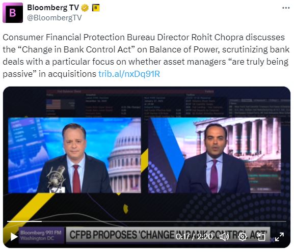 今天在彭博电视台的权力平衡早间版节目中,主持人乔·马修和凯利·莱因兹采访了消费者金融保护局局长罗希特·乔普拉,谈到了该机构在信用卡费用、买现付以后计划以及对银行交易的审查等问题上的工作。