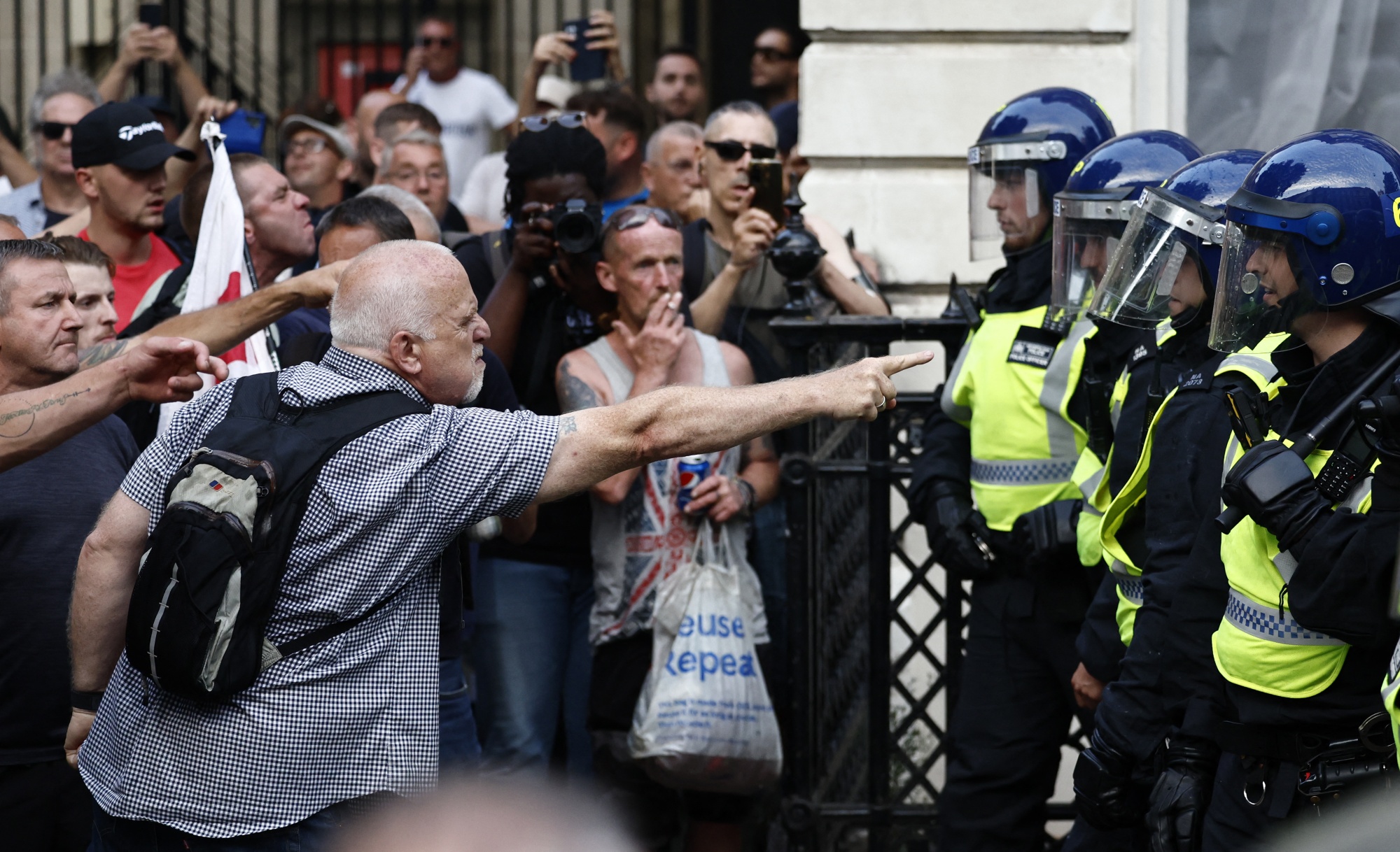 抗议者在唐宁街10号入口处与警察对峙。