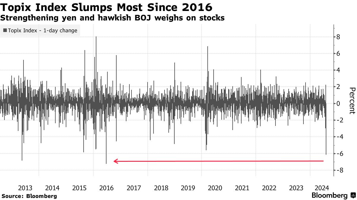 日本银行周三决定将利率提高至0.25%,引发市场波动,东证指数当天上涨1.5%,但在周四和周五又大幅下跌。