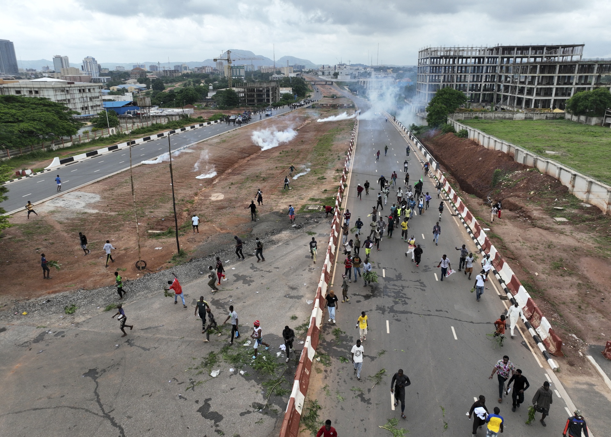 抗议者在尼日利亚安全部队于8月2日在阿布贾举行的“结束糟糕治理”抗议活动中逃避催泪瓦斯的袭击。