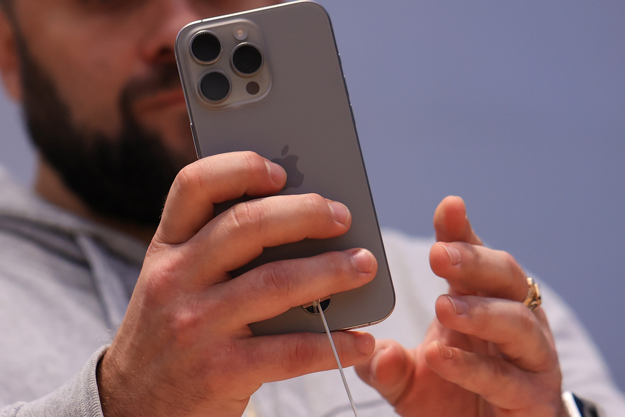一位苹果客户使用iPhone 15 Pro。摄影师:Krisztian Bocsi/Bloomberg