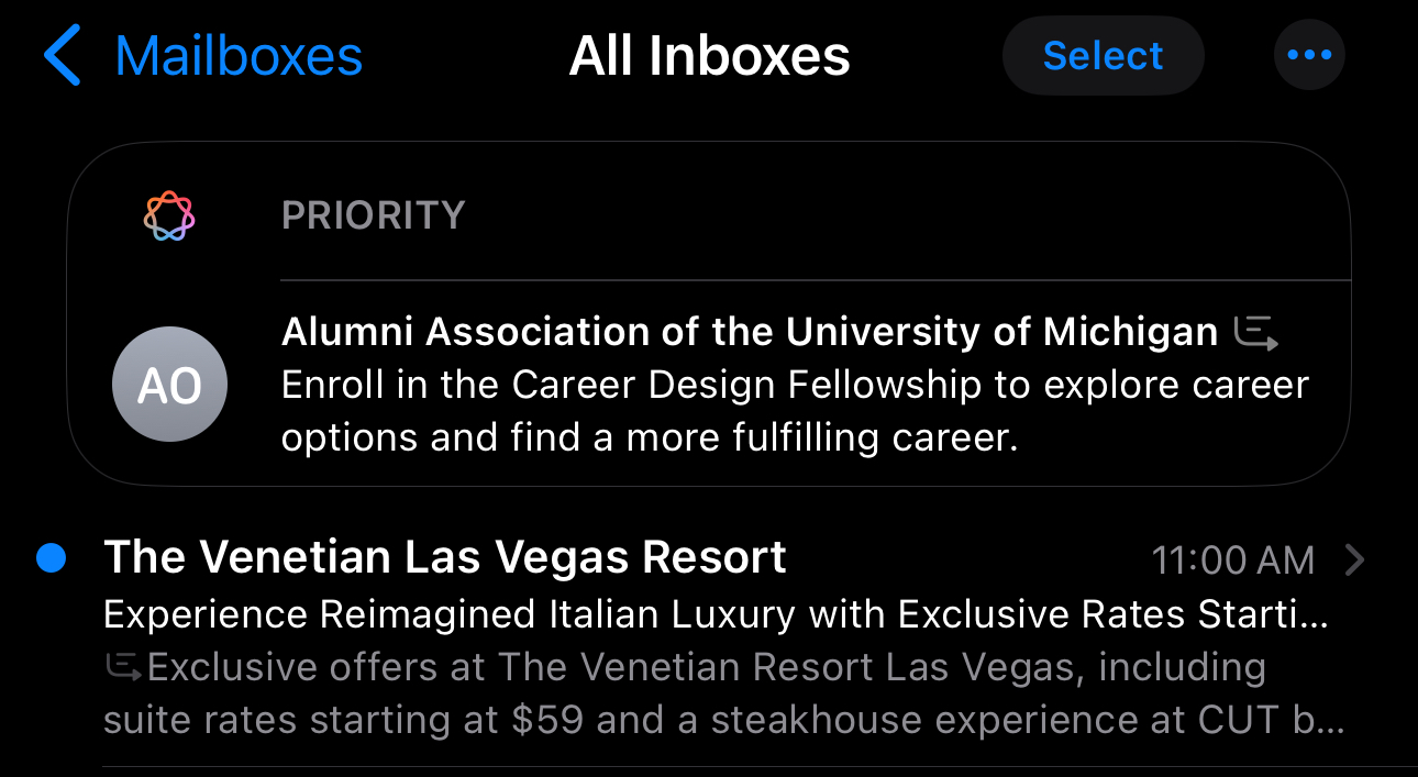 - 邮件应用中有一个新部分,显示系统认为是高优先级的消息,以及电子邮件的摘要。