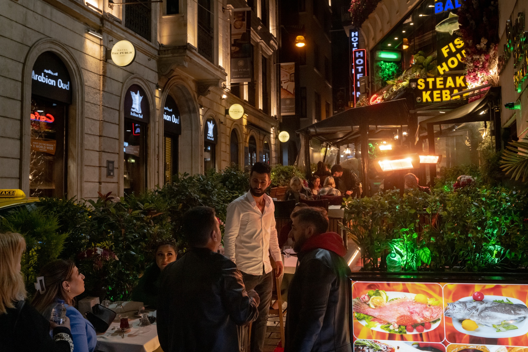 一名服务员在伊斯坦布尔独立大街的餐厅迎接顾客。