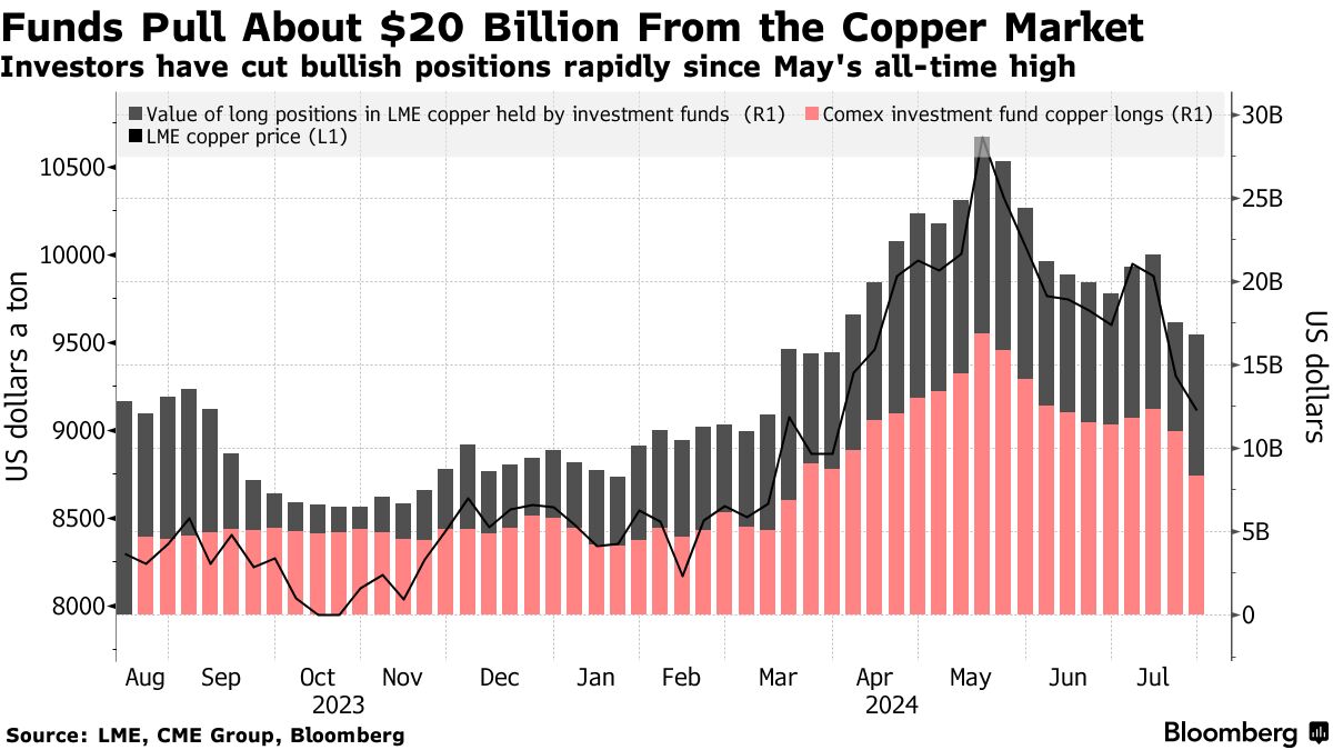 自5月中旬以来,资金经理已关闭约200亿美元的看涨铜头寸,对中国需求的担忧不断加剧,促使人们从这一重要工业商品中撤出。5月,铜价飙升至每吨超过11,100美元的历史新高,投资者展开了前所未有的购买狂潮,但此后价格已下跌约15%,资金正在撤退。随着价格在9,000美元左右,关键问题是撤离的潮流是否结束。Comex和伦敦金属交易所的看涨头寸已回到3月份的水平,尽管从历史标准来看仍然偏高。