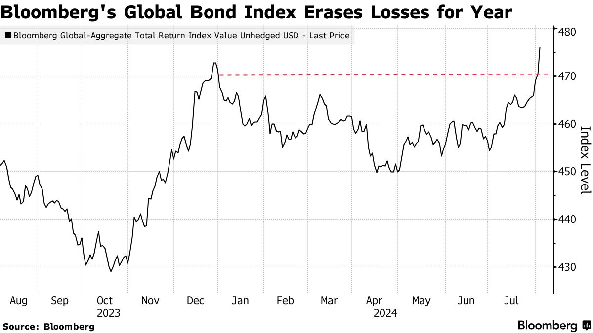 全球债券已经抹去今年的损失,因为对美国经济前景迅速恶化的担忧刺激了对固定收益资产的需求。