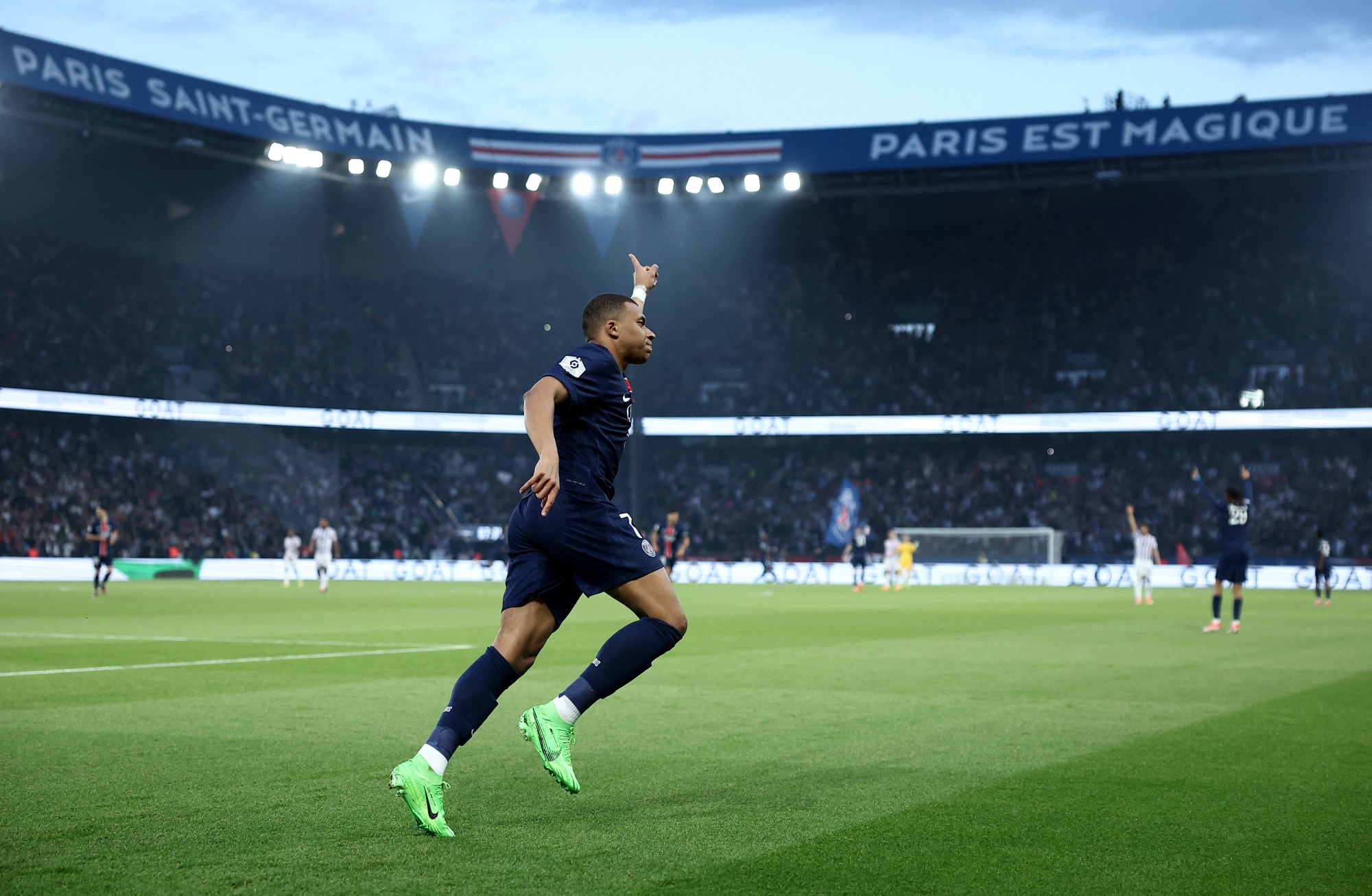 基利安·姆巴佩在5月12日巴黎王子公园体育场进行的一场法国L1足球比赛中庆祝进球。