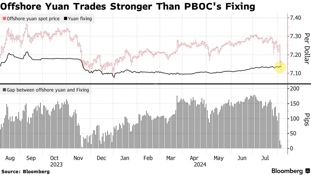 人民币兑美元一度飙升至7.1125,交易价格高于北京所谓的定价,接近抹去今年的损失。这表明市场情绪转向更加积极,此前对中国经济增长的担忧使得该货币上个月跌至自去年十一月以来的最低点。