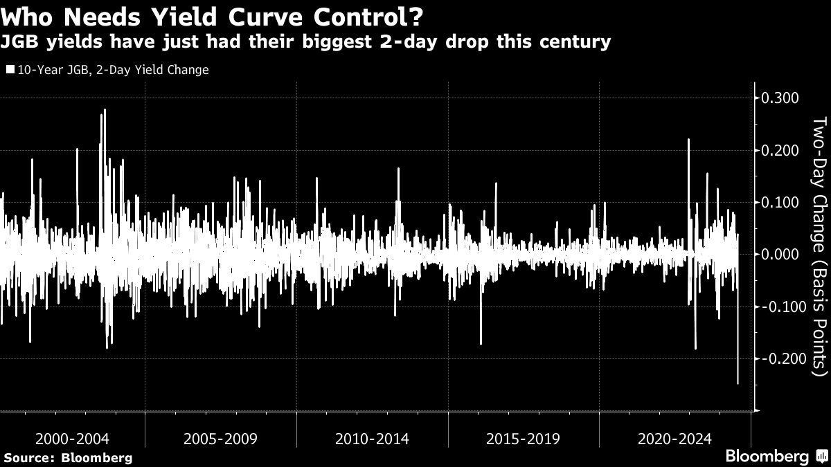 周五东京出现了相当大的抛售。在撰写本文时,周一早晨带来了非凡的续集。就在上周,日本银行宣布将减半购买债券。停止的收益率曲线控制政策,最近将10年期日本国债收益率保持在1%以下,已经彻底结束。然而,自周五市场开盘以来,我们见证了本世纪日本国债收益率的最大两日跌幅: