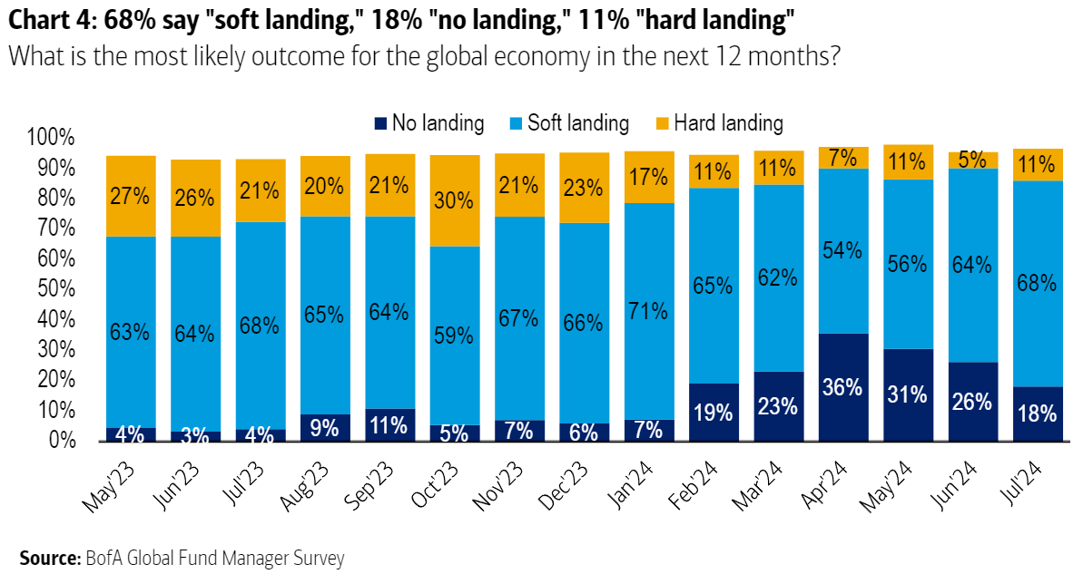 东京市场以巨大的戏剧性开启了这一周——最好将其视为 混沌理论 在发挥作用。一只在华尔街扇动翅膀的蝴蝶(在沃伦·巴菲特、美联储和无数散户投资者的帮助下)创造了东京的台风(或者变成了一只巨大的、摧毁市场的 摩斯拉,如果你是 日本怪兽经典的粉丝)。要解释原因,我们必须从价格开始波动之前的预期入手。美国银行公司进行的七月全球基金经理调查显示,对全球经济软着陆的信心很高(预期为68%)。硬着陆的可能性仅为11%,尽管这确实比年初有所上升: