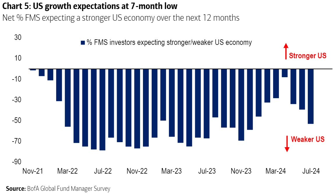 对于金融资产而言,对软着陆的信心造成了价格硬着陆的风险,这种风险现在似乎正在发生。虽然很多人认为任何放缓都会是温和的,但经济 疲软的想法正在形成。预计未来12个月美国经济强劲的比例降至七个月来的最低:
