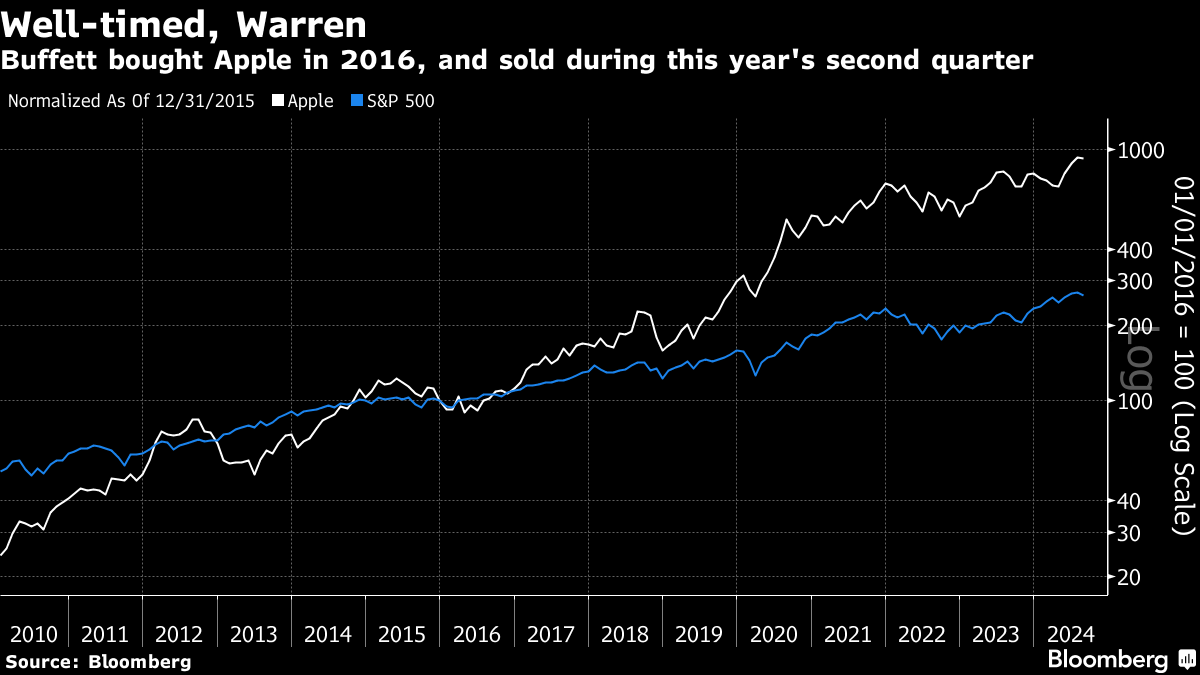 我邮箱中的许多人似乎对沃伦·巴菲特相当恼火。这是因为周末的消息称,伯克希尔·哈撒韦公司在第二季度出售了大约一半的苹果公司股份。它在2016年进入该股票,正如这张终端图表所示,巴菲特的时机似乎一如既往地完美。标准普尔500和苹果在伯克希尔购买时都被标准化为100: