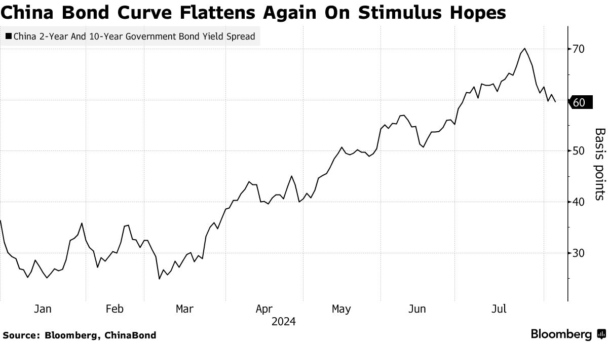 2年期和10年期债券之间的利差在周一缩小至约60个基点,较7月底的约70个基点有所下降。4月份,当北京开始考虑债券交易策略时,差距约为40个基点,此时正值对泡沫形成的 警告。