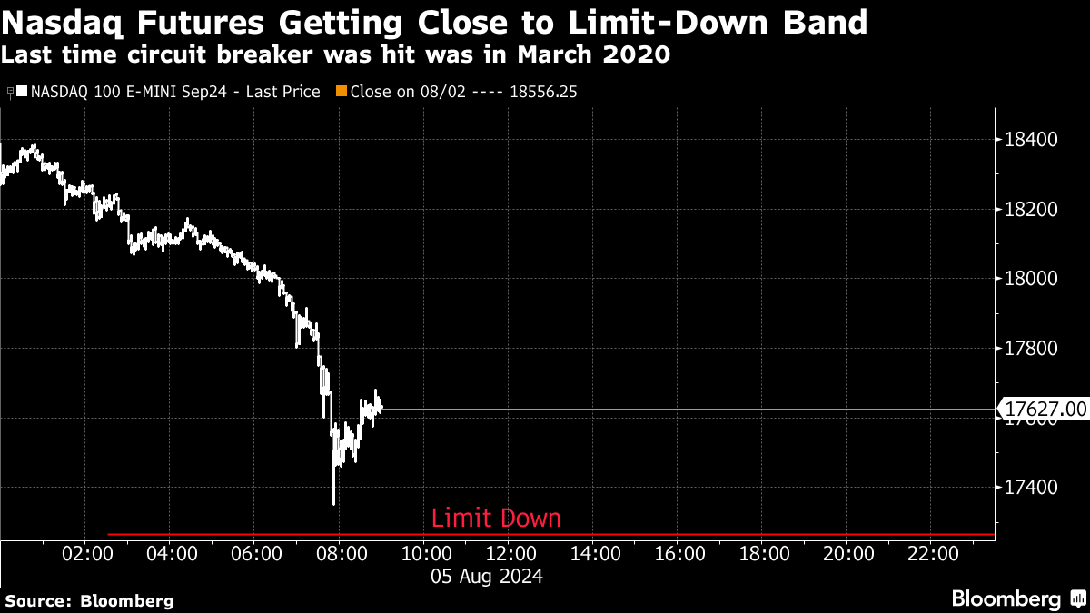 全球股市暴跌加速,损失蔓延至科技股,纳斯达克100指数期货下跌3%,日本股市暴跌幅度超过十年来的最大。随着对美国经济放缓的担忧加剧,交易员们加大了美联储将采取紧急降息的押注,预计在一周内降息25个基点的概率为60%。纳斯达克100期货一度下跌6.5%,接近触发熔断机制。