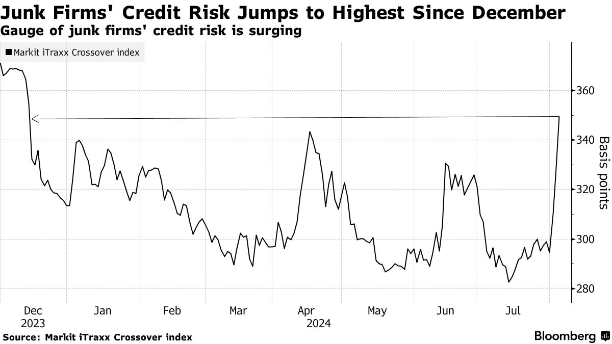 信用风险和利差在今年大部分时间里一直在下降,因为投资者追逐高收益,尽管违约率上升,经济衰退的担忧被搁置;彭博社的垃圾债券指数的违约率上升至2.96%,超过了疫情时期的1.8%。最新的波动表明,如果对美国经济放缓的担忧加剧,可能会出现转折点。
