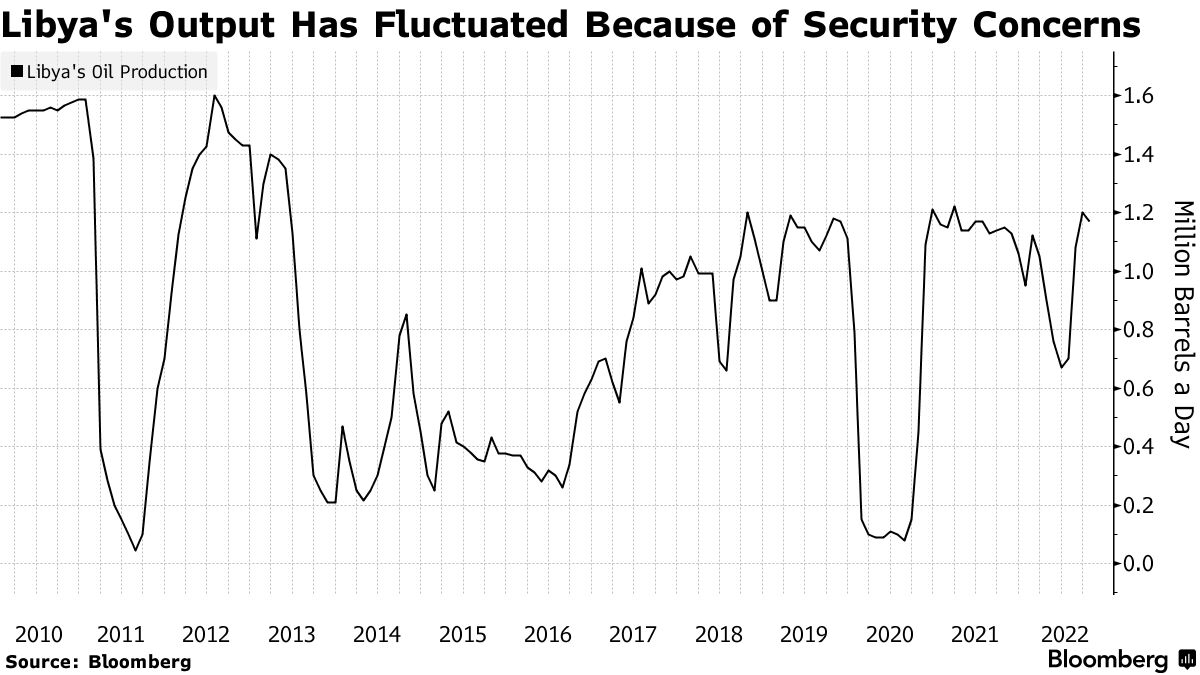 这个非洲国家的产量在2008年达到了近180万桶/天,但在2011年内战中穆阿迈尔·卡扎菲被杀后骤降至约10万桶。从那时起,产量一直波动,尽管最近几个月大致稳定在约120万桶/天。