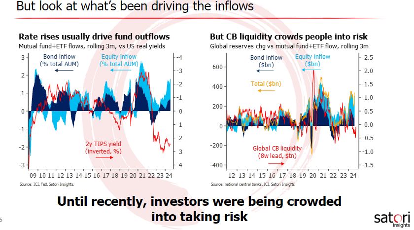来源:Matt King, Satori Insights这是由于中央银行资产负债表变化而导致的挤入和挤出效应,我认为这比广泛认识的要重要得多,即使你试图理解共同基金流动。今年是有记录以来第二大年份,仅次于2021年,我们有6000亿美元的整体流入。对我来说,直到最近,这一切都是由全球中央银行储备数字的挤出效应直接驱动的。