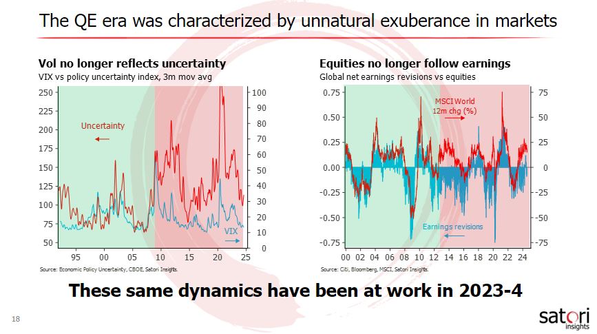 过去与不确定性之间有很好的关系,自2012年以来,不确定性在不确定性指标、新闻中提到不确定性的次数等方面往往相当高。然而,大多数时候波动性却非常低,我认为所有这些动态与这种由货币创造主导的模式是相辅相成的,而货币创造直接来自中央银行,这在我的关系中体现出来,而我们在这里经历的波动相对于来自私营部门的货币创造的波动来说实在是太大了,这就是它们最终主导市场的原因。