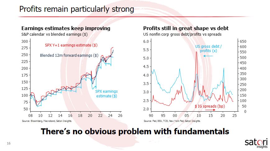 如果有什么事情可能会稍微逆转,我认为风险的平衡因此倾向于更高的波动性,至少不会让股票市场反弹,我愿意为股市内的进一步轮动做好准备。再次强调,在我看来,整个科技行业在这一点上确实显得有些过于紧张。但即便如此,我并不是对价值行业、银行以及目前表现良好的事物持完全看涨的态度,如果有进一步的特朗普交易,可能会受益。在我看来,所有事情最终都变得比以往更脆弱,因为这个顺风已经不复存在。