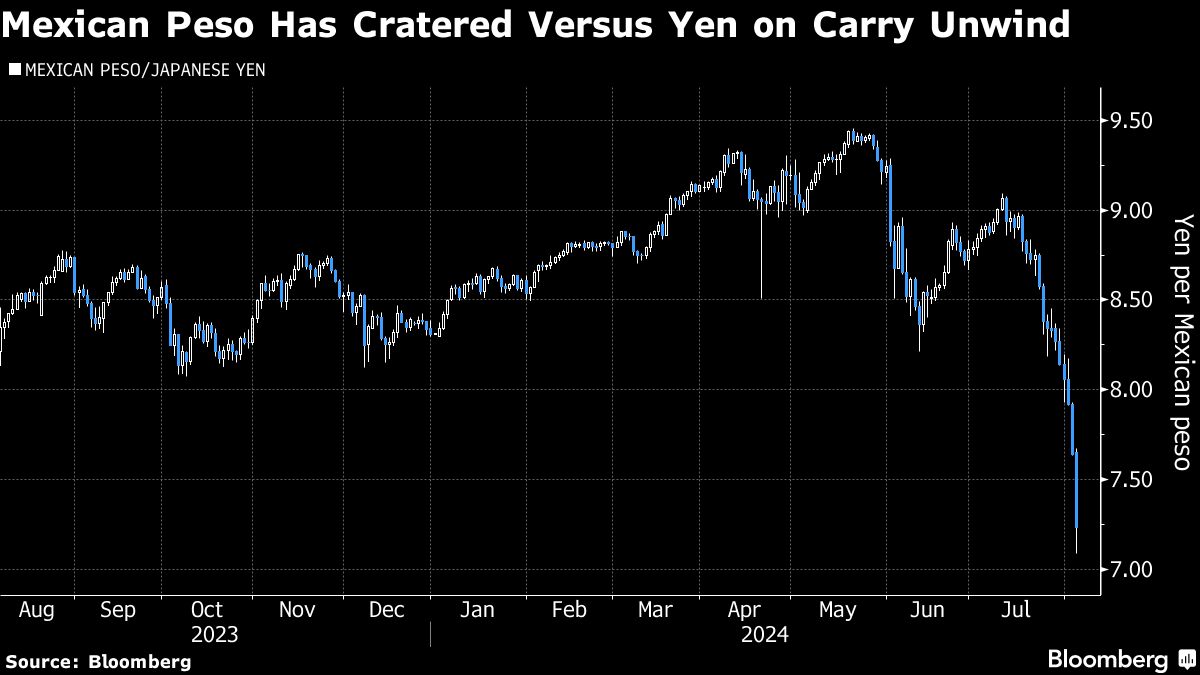 尽管日本日元在周一继续强劲升值,伴随中国人民币的表现,墨西哥比索的贬值却加深,投资者正在解除利用这两个亚洲经济体超低利率融资的头寸,以押注于收益更高的国家,如墨西哥和巴西。即使是像澳大利亚这样的富裕国家货币,作为较低风险套利交易的目标,也受到冲击。