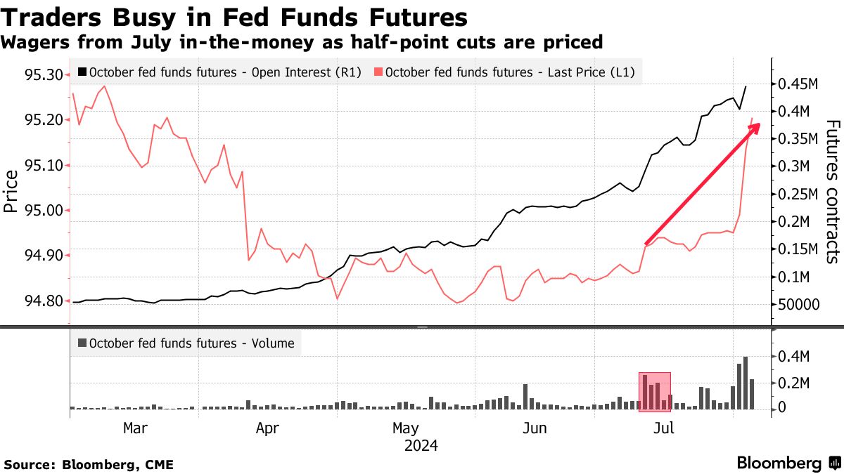 交易员们在积极放松政策的押注上没有显露出放缓的迹象。到期于10月31日的联邦基金合约周五的交易量达到了近400,000的创纪录水平,远高于当前132,000的15天移动平均水平。