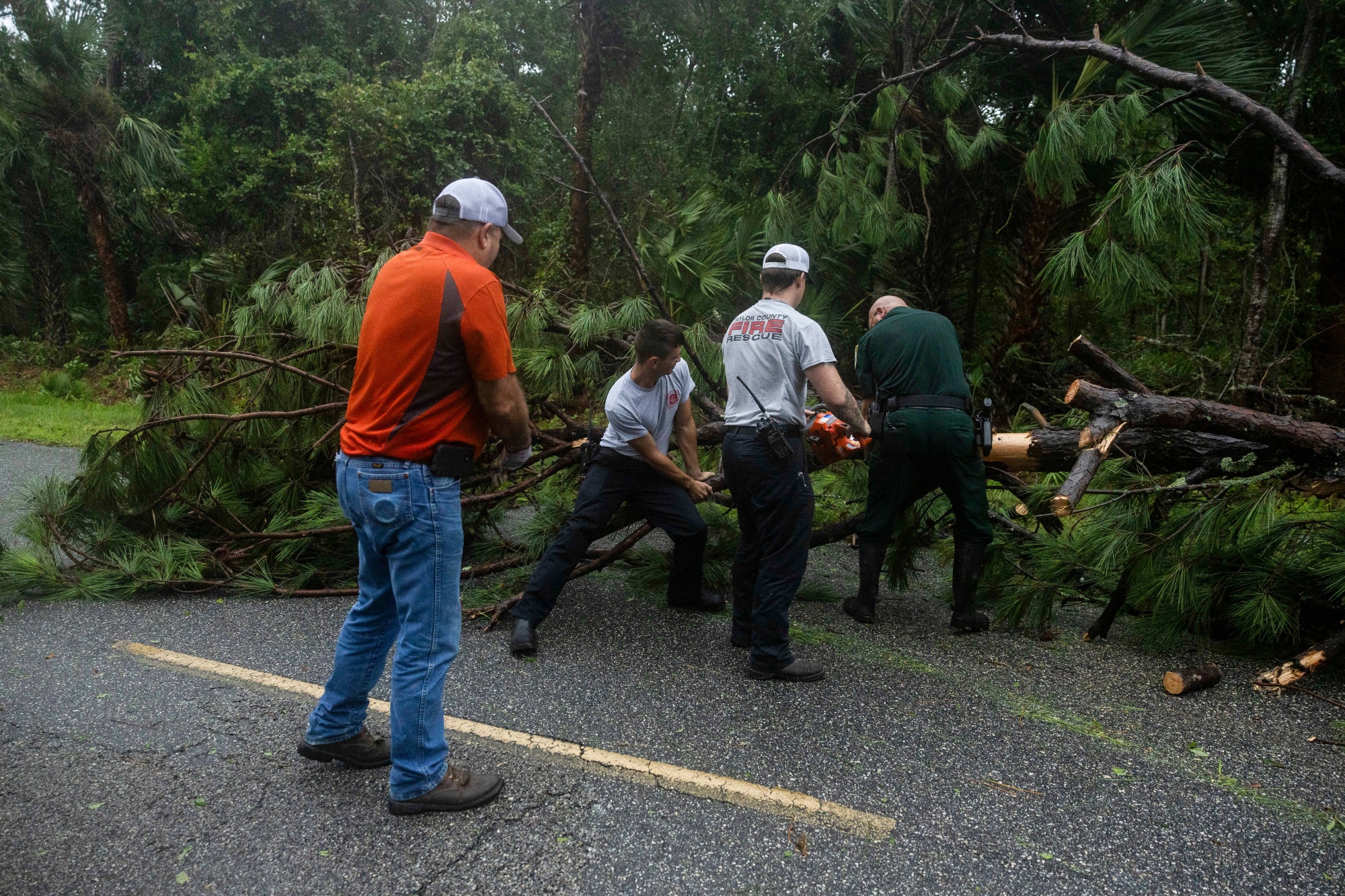 当地执法人员和消防救援队在佛罗里达州斯坦哈奇的道路上清理倒下的树木,飓风德比于8月5日登陆。
