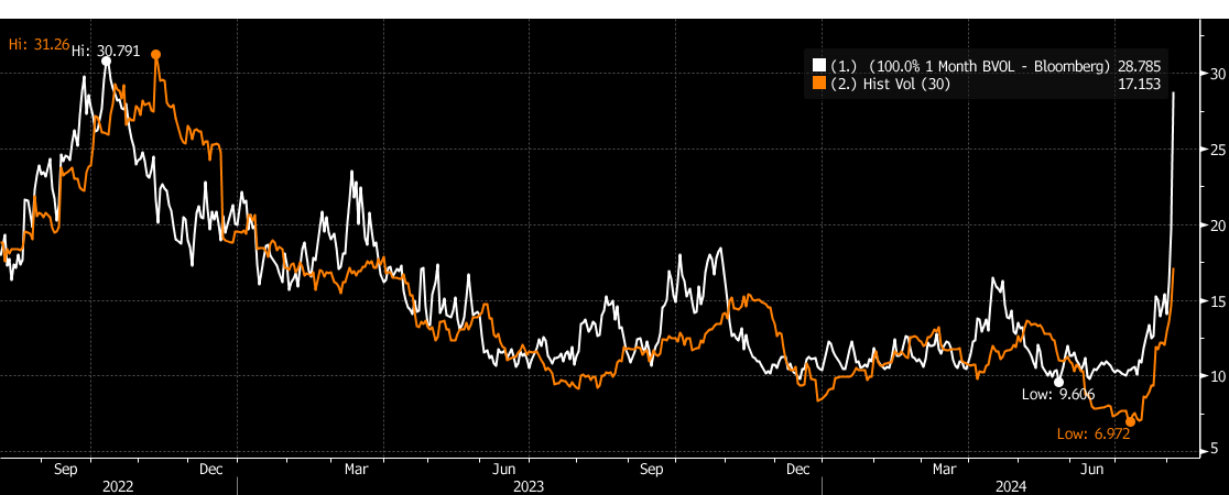 从纽约到伦敦和东京,股票遭到重创。正当市场开始庆祝美联储关于首次降息的信号时,却遭遇了完美风暴——疲弱的经济数据、令人失望的企业盈利、过度的头寸和糟糕的季节性趋势。虽然S&P 500削减了一些损失,但在强劲的交易量中遭遇了近两年来最大的下跌。以科技股为主的纳斯达克100经历了自2008年以来最糟糕的月初表现。华尔街的“恐惧指标”——VIX——在某一时刻记录了自1990年以来的最大涨幅。