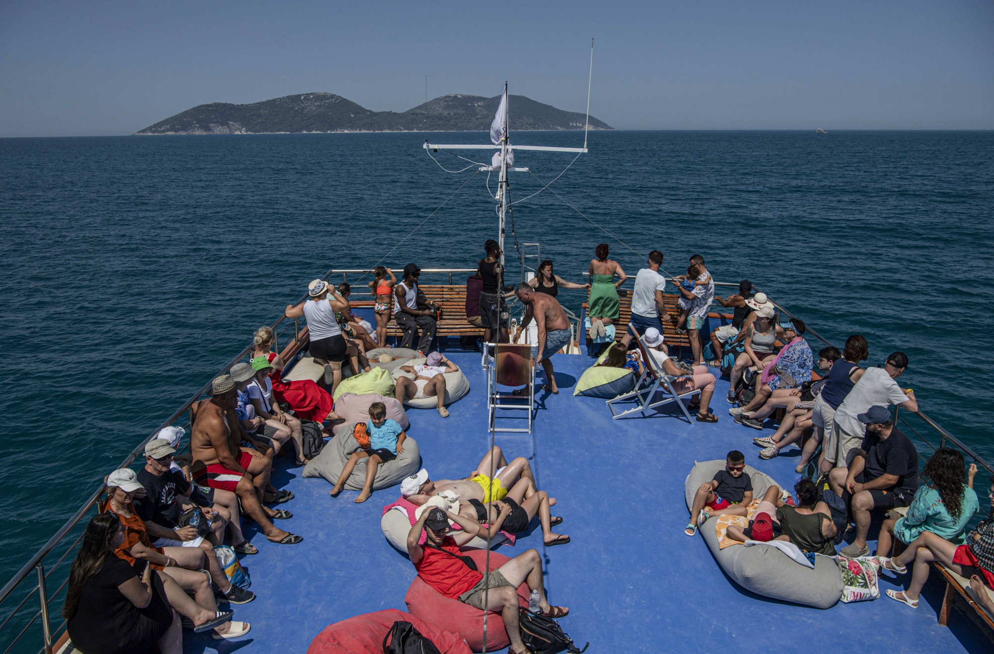 游客从港口城市弗洛拉出发,前往萨赞岛进行一日游。摄影师:Atdhe Mulla/Bloomberg