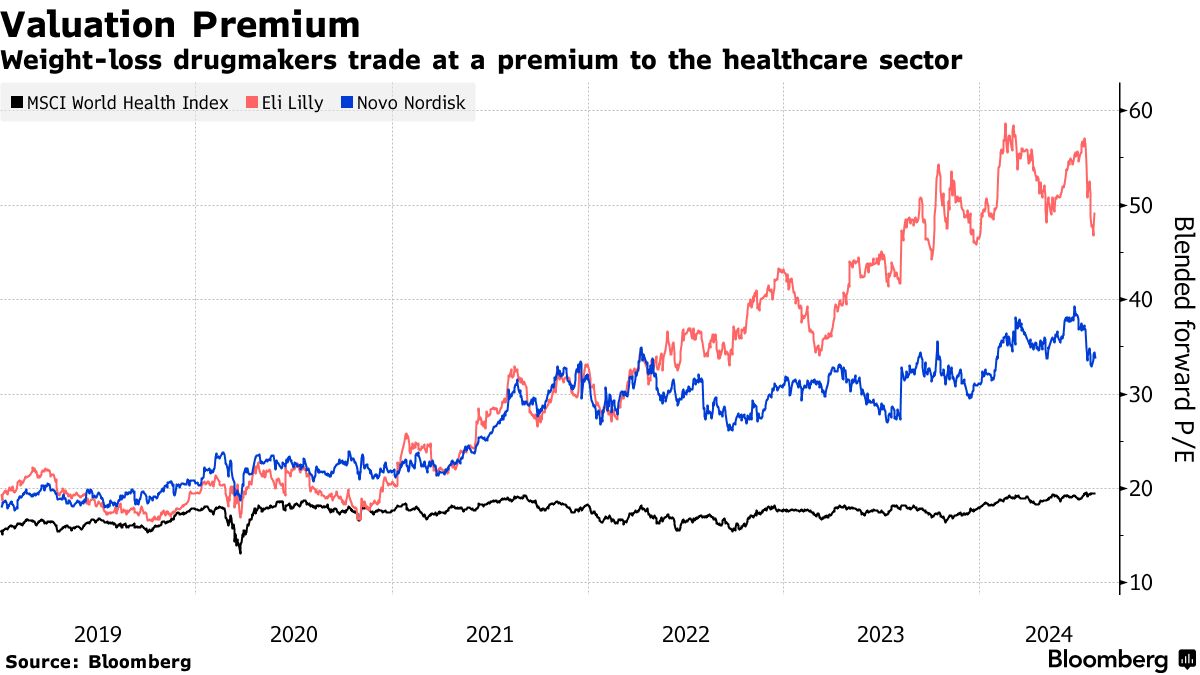 尽管礼来和诺和诺德的股票本月与大部分市场一起下跌,但它们的交易价格仍显著高于制药行业的其他公司。然而,对于许多投资者和分析师来说,这些估值似乎是合理的,因为减肥药物有潜力缓解其他风险,包括心脏病。
